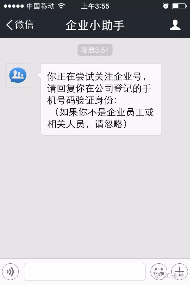 企业小助手是干什么的呢,看下面一张图片,是打开腾讯企业号的小助手后,自动回复给咱的一段话,你感受下: