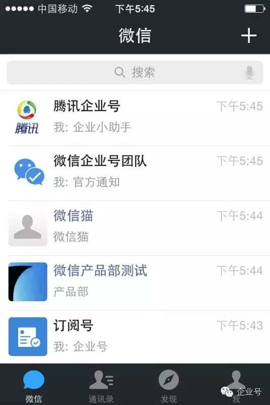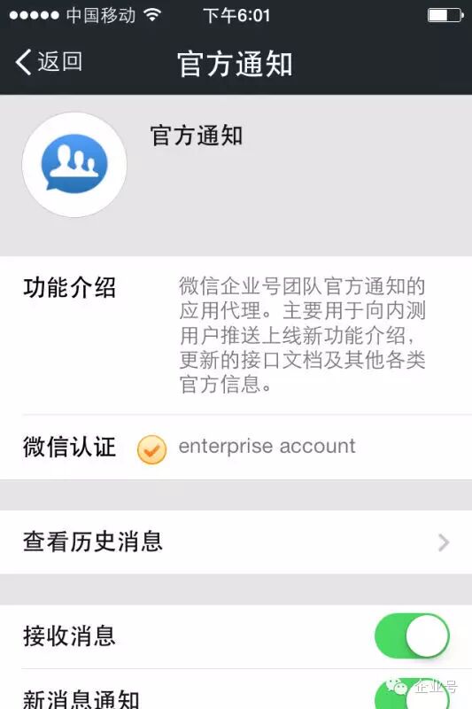 有一个账号比较特别,叫做:“微信企业号团队”。神秘,目前在微信里无法找到它。一会儿向您展示几张它的“照片”。