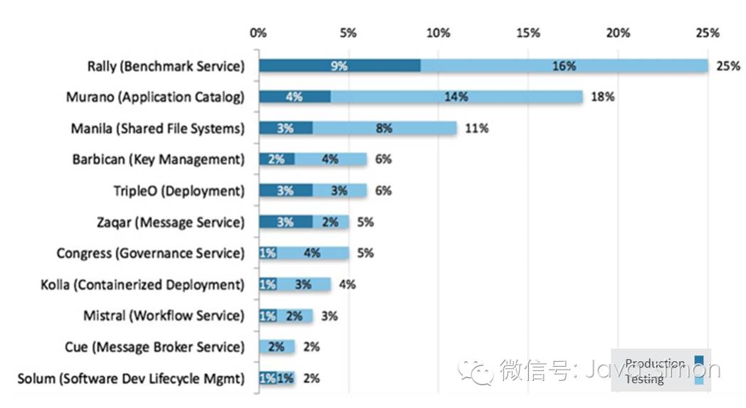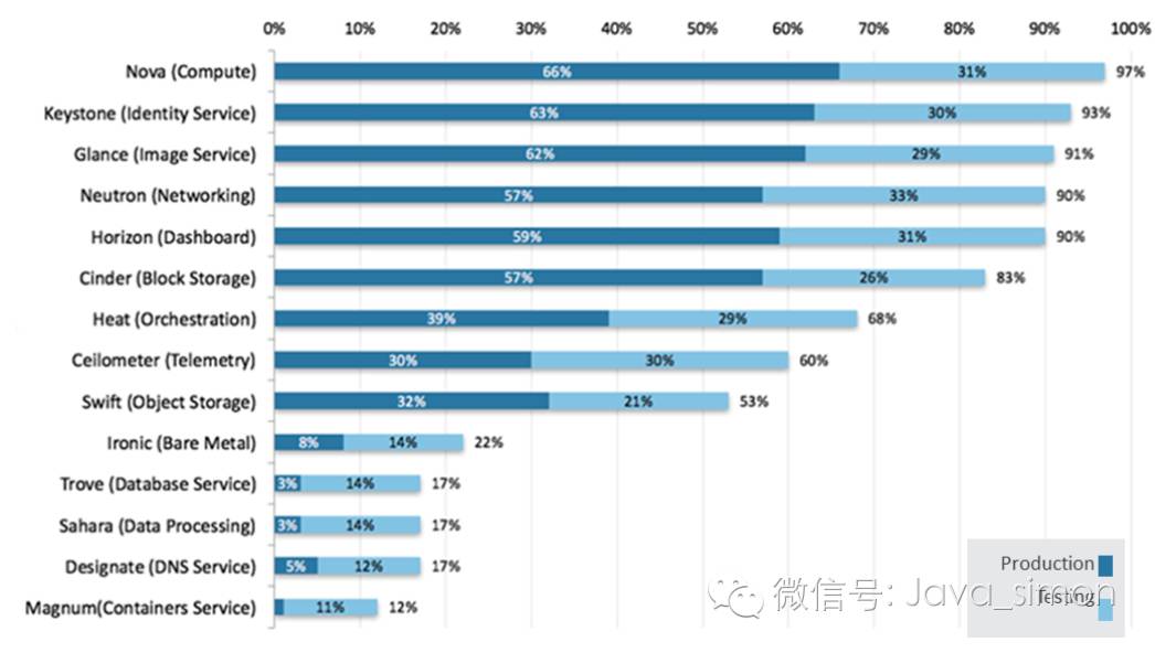 在回答了这个问题的 290 份部署中, 采用最多的六大项目 (Keystone,Nova,Horizon,Glance,Neutron 和 Cinder) 都在生产中。