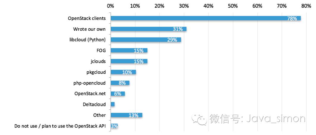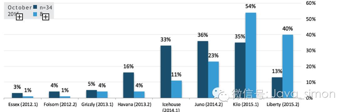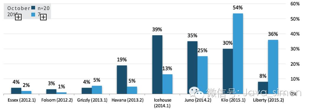 而去年用户运行三个最新版本所占比例最高的是 Icehouse(最后一个周期:33%),Juno(36%), 和 Kilo(35%), 在这个周期内有一个强推动力让用户去采用更新的版本。现在,94% 的部署都在使用 OpenStack 的最近的两个版本。