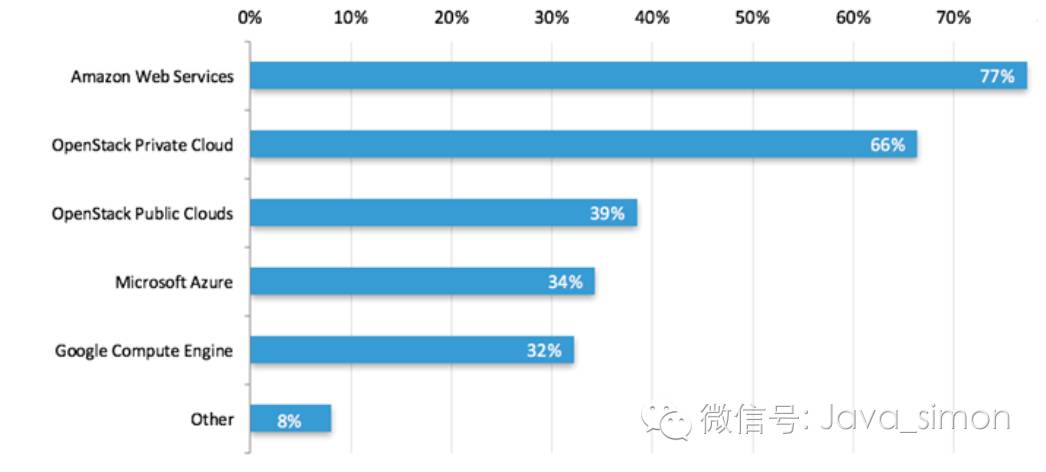 应用程序开发人员提及的五个选项之外的其他云包括:DigitalOcean,Joyent VMware vCloud /Sphere,CloudStack、CloudSigma,IBM Softlayer, 甲骨文云。