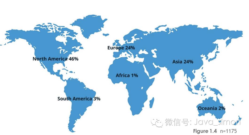 从洲际层面上来说,欧洲和亚洲现受访者大约都占 24%。对欧洲来说虽然这只是一个轻微的上升(2%),但是亚洲的受访者代表从一年前的 23% 上升到现在的 28%。