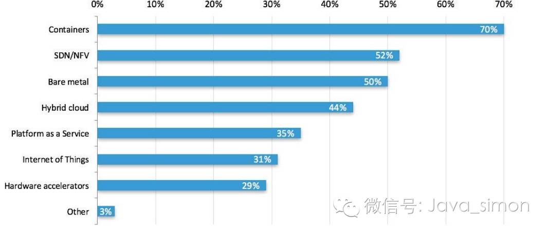 「容器」仍然是本次调查中受访者最感兴趣的选项, 这个周期为 70%, 比上一个调查周期低 6 个点。软件定义网络 (SDN) 和网络功能虚拟化 (NFV) 是第二感兴趣的选项, 虽然比上一周期的 59% 低了 7 个点。