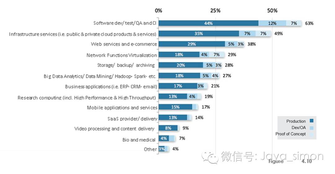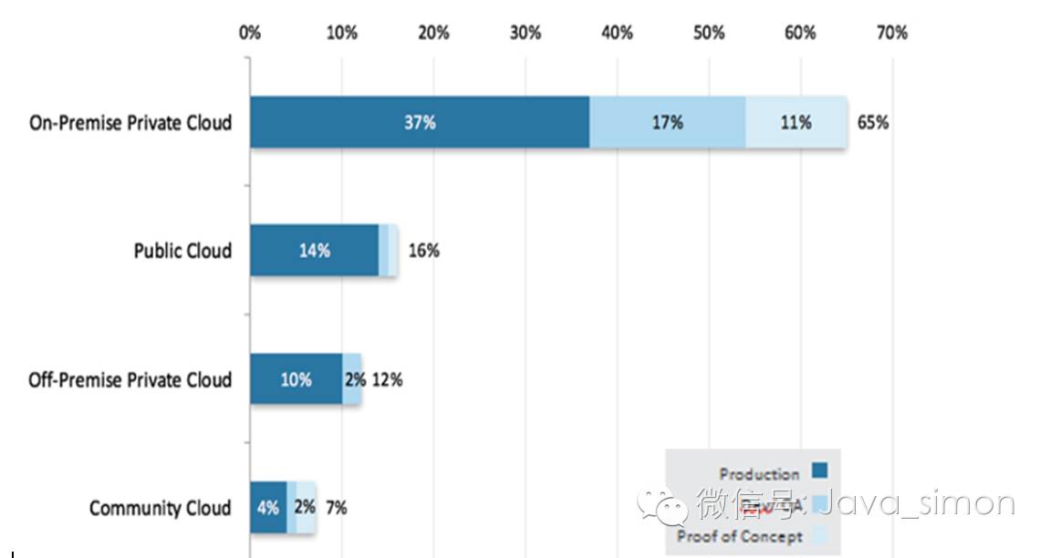 将近三分之二的部署都是在本地私有云上, 比去年增加了三个点, 并且超过一半是在生产领域。公共云的总部署数量从 19% 下降到 16%