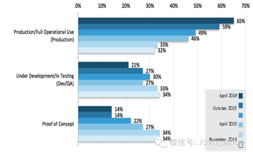在上次的调查中, 这在测试或在生产的六大项目部署率在 78% 和 85% 之间。本次调查中, 采用率飙升至 83% 至 97%, 有 5 个项目采用率为 90% 或更高。