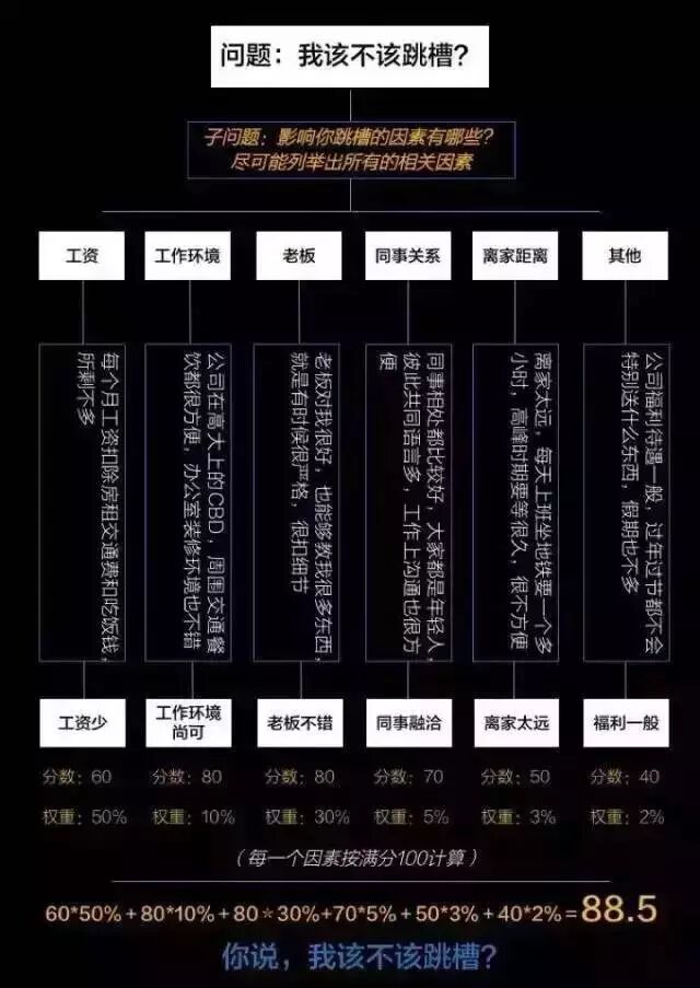 举个例子,比如你现在遇到的问题是:“我该不该现在跳槽?” 那么对这个问题的分解可以如下图所示:
