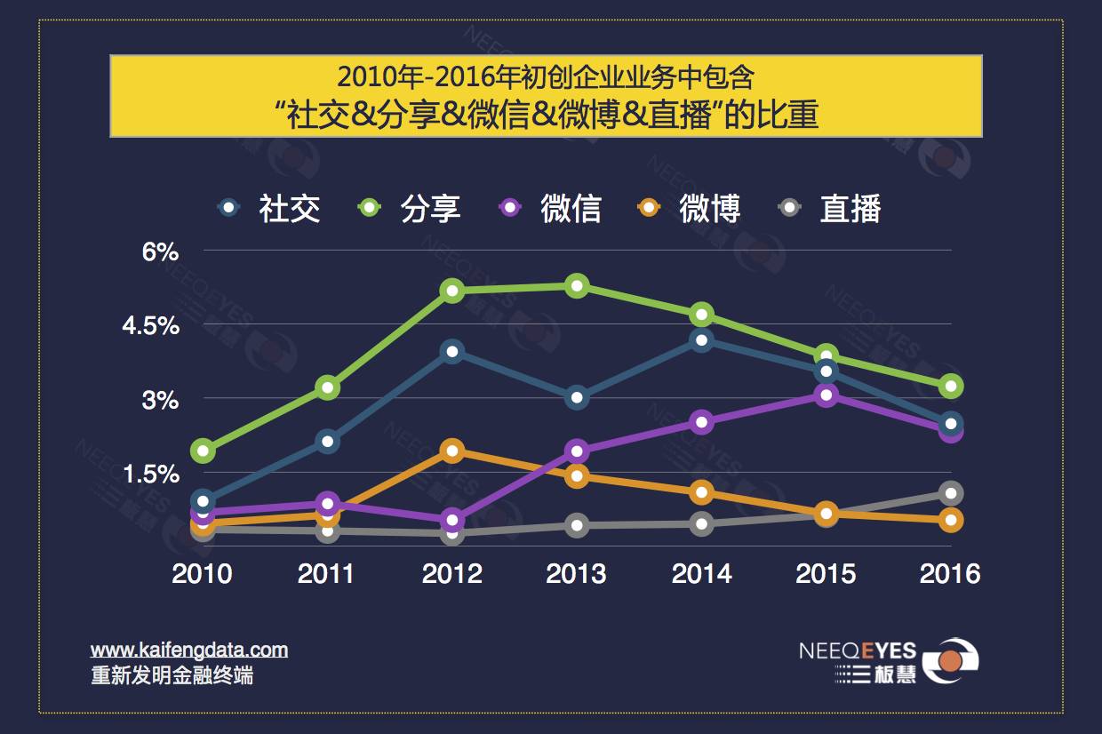 “社交”在初创企业中被使用的频率在2010年至2012年间持续上升,随后两年出现了一些波动,进入2014年后,开始逐年下降,至2016年占比较2014年减少了近40.60%。与此同时,相关的词也发生了不同程度的衰减,其中减幅最大的词是“微博”,在2012年至2016年间,主动使用“微博”描述自己的初创企业占比减少了72.27%。