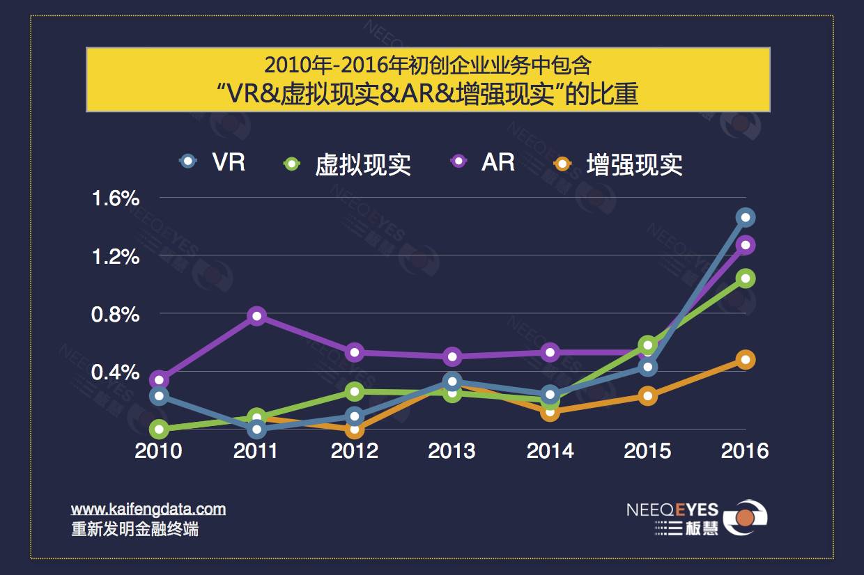 在2010年,“虚拟现实/VR”几乎只在科幻电影中出现,所以我们基本上看不见有初创企业描述自己的业务与“虚拟现实”有关并且获得风险投资,但2016年的数据显示,已经有0.7%的初创企业提及了“虚拟现实/VR”这一词汇。