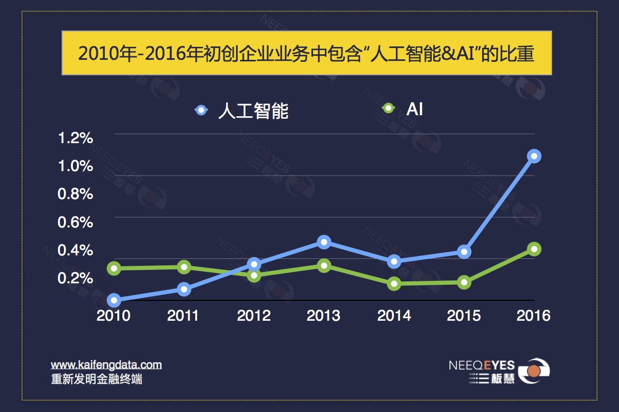 2013年,“人工智能/AI”形成了被风投青睐的第一波热潮,两个词分别占初创企业的0.42%、0.12%,较上年占比增长了58.94%和43.43%。
