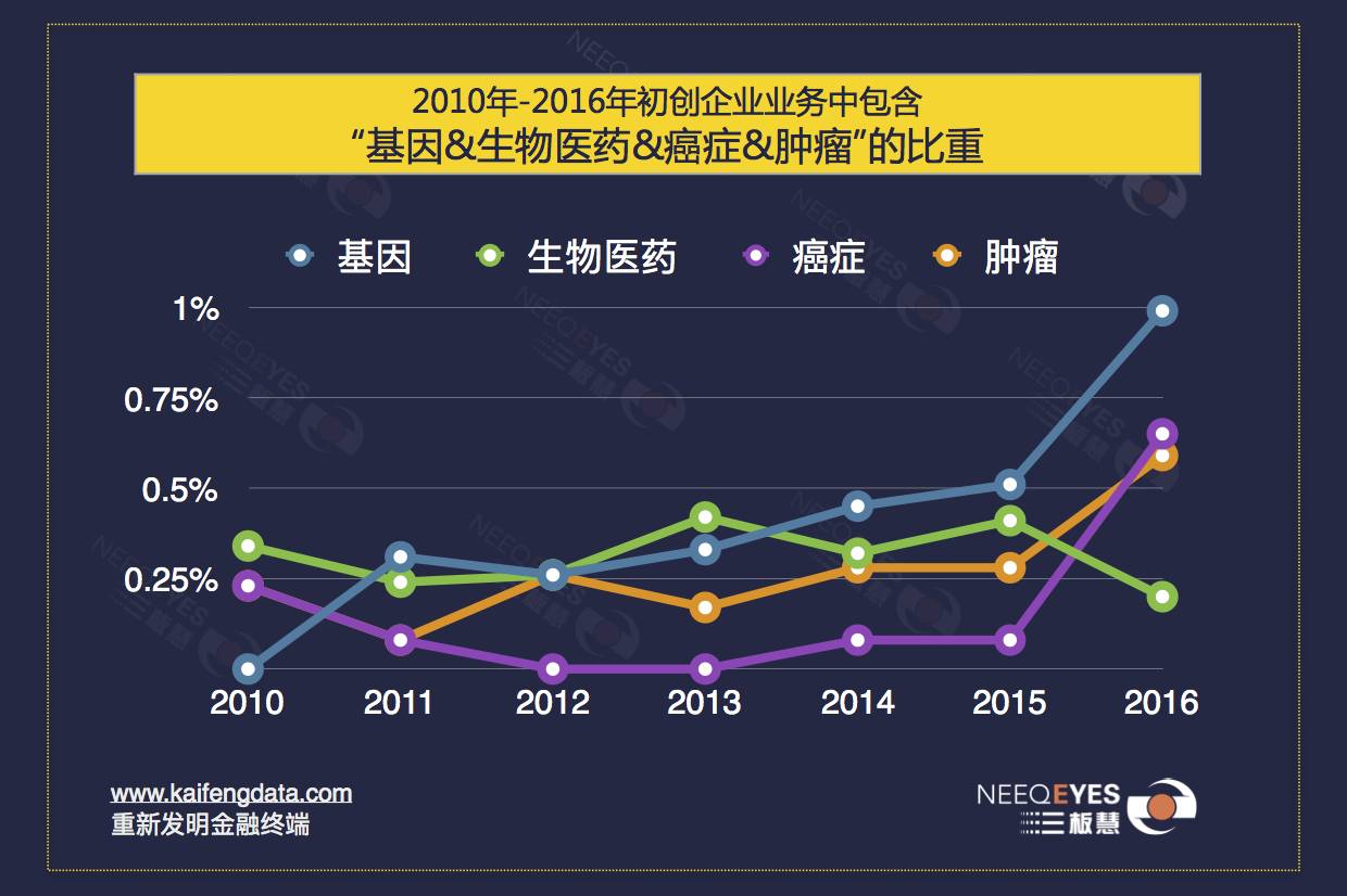 在医疗健康领域中,“癌症”、“肿瘤”、“基因”正在流行,尤其是在2016年,这三者的势头已盖过“生物医药”,分别占初创企业的0.65%、0.59%和0.99%,占比增长率分别达751.32%、112.59%和94.66%,而生物医药却降至0.20%,占比降幅达51.3%。