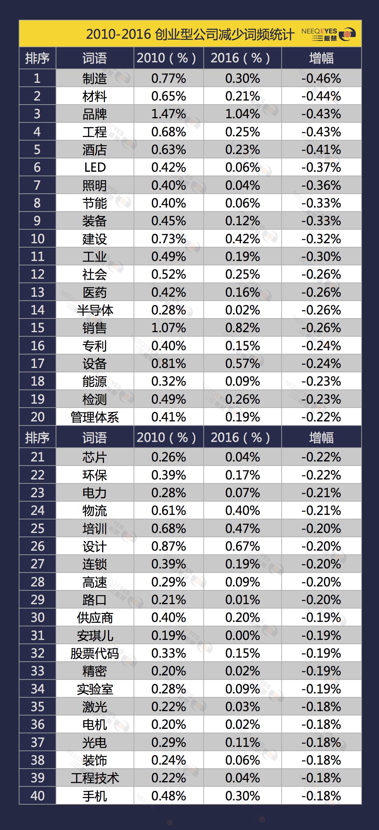 降幅最大的是“制造”、“材料”这些和传统行业有关的词汇,几乎将近一半,像这样的词汇还有“建设”、“工业”、“物流”、“电力”等。