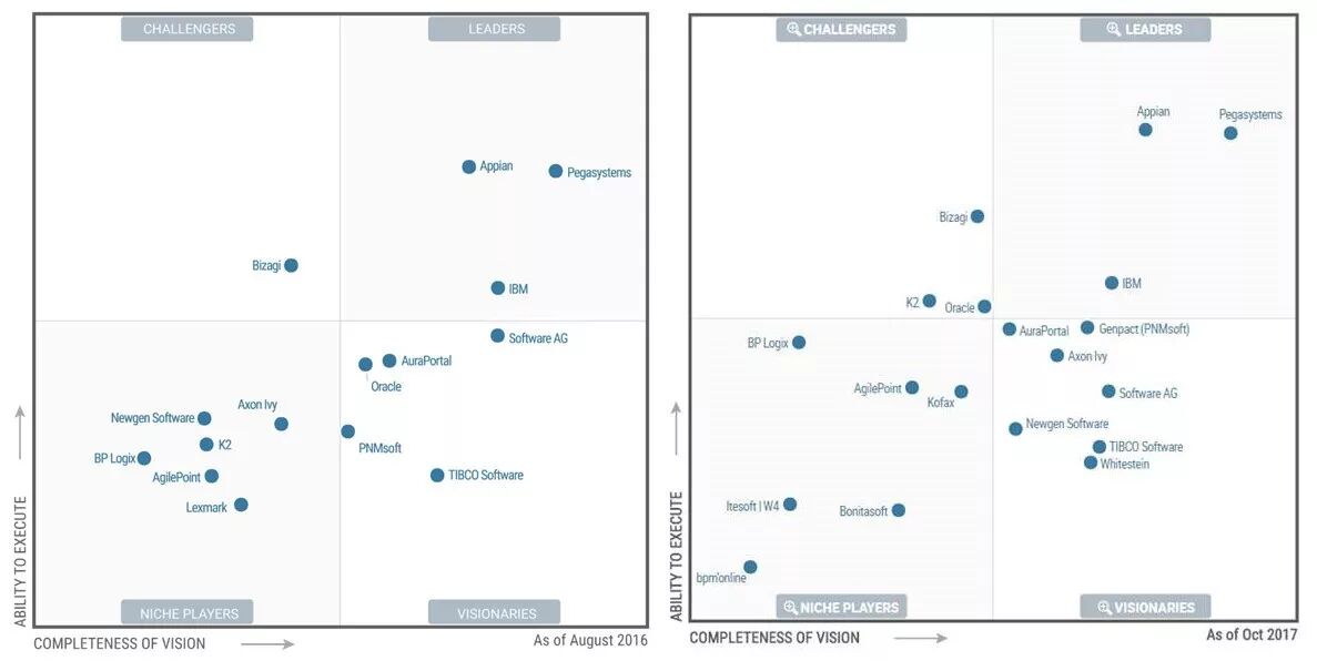 从两年的象限对比来看,Pegasystems, Appian和IBM依然占据着龙头地位,只是Appian、Pegasystems与IBM的差距在拉大。K2进步显著,从特定领域者的中间位置跃升为挑战者,其工作流引擎在业界享有盛誉。Oracle从有远见者进入挑战者,说明它的执行力得到了提升,但是创新力上略降。