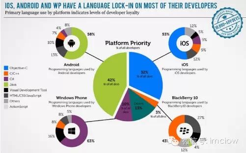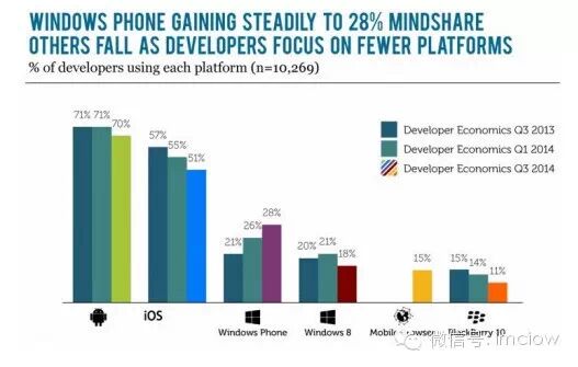 在全球层面上,移动平台战争以iOS占据高端设备市场,而Android几乎随处运行宣告结束。尽管Android以70%的绝对优势拔得最受开发者青睐的平台头筹,而iOS则以51%的比例屈居第二,但结合此前一系列的开发者经济报告来看,移动平台分布于悄然之间已发生变化,iOS和Android的开发者青睐度正在逐渐流失,而与之相反的是,Windows Phone的开发者心理份额稳步提升至28%,是唯一一个未减反增的平台,虽然它目前的市场占有率并不尽如人意。