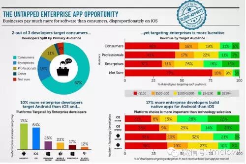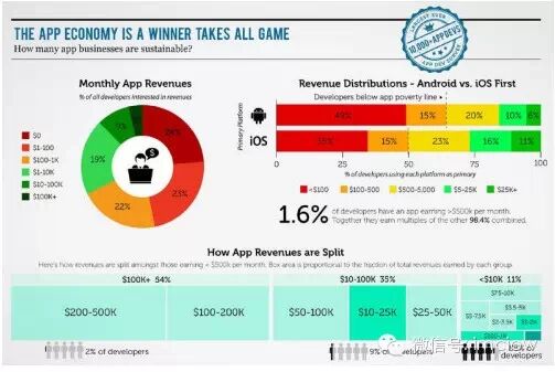 数据显示,67%的开发者专注于用户应用开发,11%从事专业应用开发,企业应用开发者占16%,而其收入则要比前两者多得多,平均每款应用收入5000美元/月的开发者数量是用户和专业类应用的两倍左右,每款应用月收入超过2.5万的数量则接近三倍。