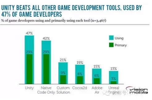 而在游戏类别方面,多平台成为主流。专业的游戏开发者的目标平台平均就有3个,而非游戏开发者平均起来也有1.75个,多平台游戏如此盛行从很大程度上来说是得益于众多跨平台游戏开发工具层出不穷,在此之中,Unity以47%的高比位列头把交椅,而Cocos2d、Adobe、虚幻引擎的使用比例分别为19%、15%、13%。苹果和谷歌最新发布的图像技术为移动游戏带来了更为丰富的游戏体验,诸如Unity、虚幻引擎等的第三方游戏开发工具则能够让开发者尽情地利用这些功能。