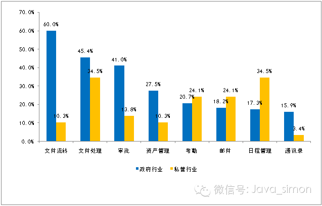 另外,从不同特点的行业对比来看,在政府以及与政府紧密相关的国有企业等机构,围绕文件处理的相关功能组件的应用非常普及,包括文件流转、处理、审批等。因为,政府行业和企业应用特点不同,所以在功能上也会有所差异。