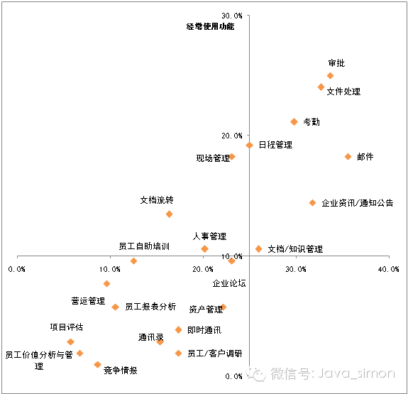 从我们的调查显示,从现有部署的部分功能上来看目前的移动OA相对比较完善,能够满足企业一般常见的业务支撑需求。调查数据显示,在具体实践中经常使用的功能主要集中在审批、文件处理、考勤、日程管理、现场管理、邮件、企业资讯等能够快速上手并进行信息交互的功能。而这些功能基本上每家产品都有,在产品竞争中没有亮点出现。因此,可以判断移动OA近期会陷入低价竞争期,也会出现OA不把移动OA当产品,而完全是一种买一赠一的附加品,一旦这样的情况出现,该厂商的移动OA在创新和设计将很难有所突破,因为没有营利就不会申请更多的经费投入到移动端的研发,只能采取跟随策略人云亦云。