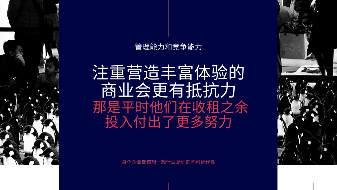 我们不希望看到大多人一昧鼓吹业主方减租的原因还在于——当减租自下而上蔓延到了整个商业地产,就说明疫情的影响还在加剧。我们更希望看到的是卓越而有效的管理团队能够携手自己的品牌商户,携手共进地在充满变动的环境中为行业树立一些有参照标准的应对之道。