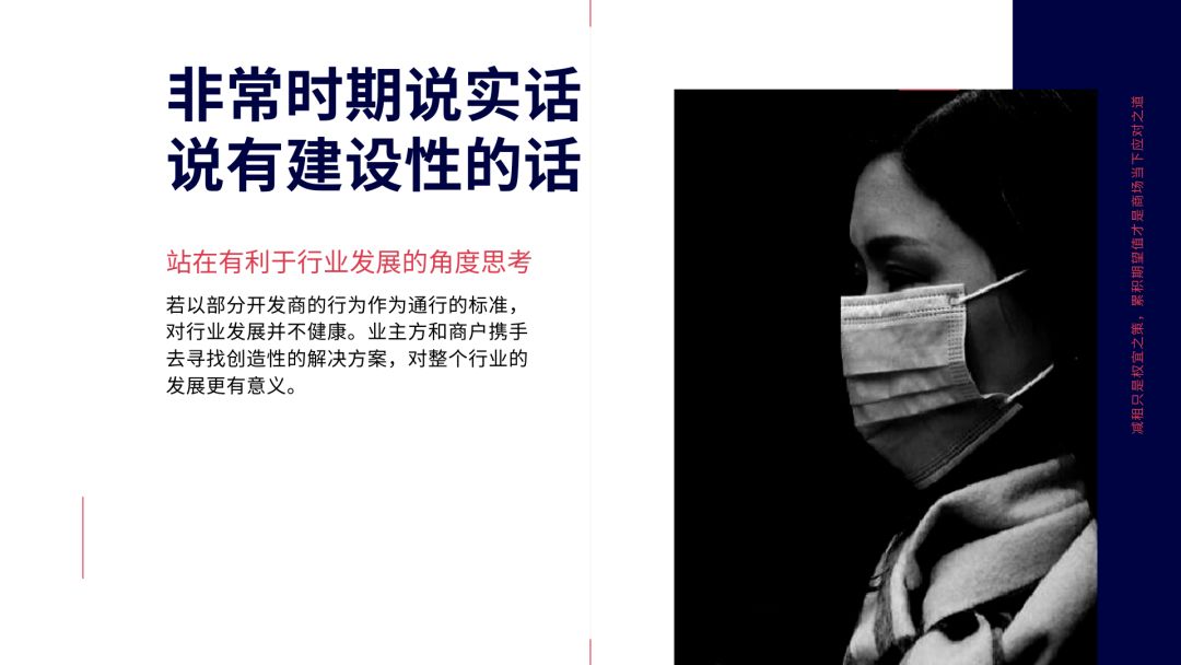 不是反对减租,但商业地产本就是一个投资回报相对较慢的行业。对于有些商场,租金是很重要的构成部分。这些商场在疫情下也同样是受影响的一方——向宅区捐款、调整营业时间、员工上班时间延后(有些更严谨的企业甚至要求从外地回来的员工自行在家隔离14天)、加强商场的安全防护等等,他们也同样面临各种各样的压力。在这片舆论呼应的减租声中,情感的渲染让很多人忽略了商场方与品牌商户之间都是签有相关租赁协议的,品牌商户会根据自身的经营情况去与业主方协调处理。这时候若以部分的开发商的行为作为通行的标准,对行业发展并不健康。业主方和商户携手去寻找创造性的解决方案,对整个行业的发展更有意义。