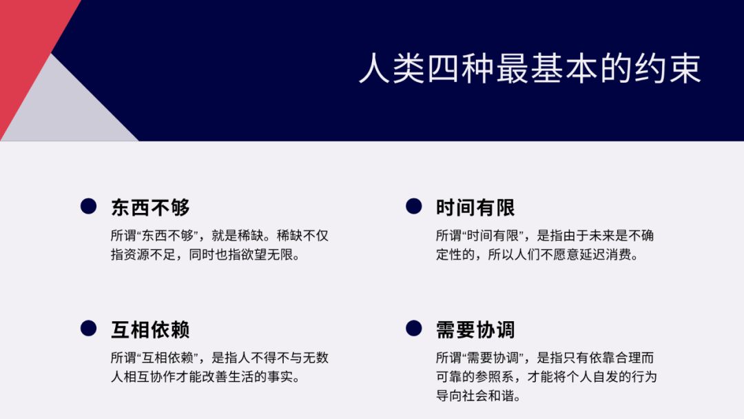 我们所处社会的种种现象和制度安排,无一不是为了适应以上四种基本约束而衍生出来的。