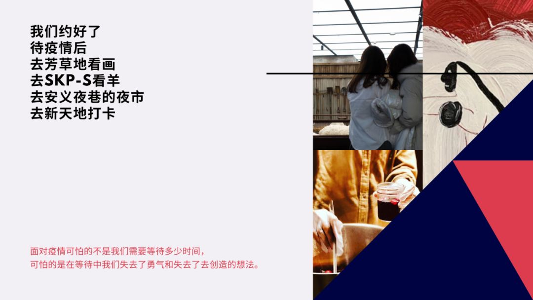 这时候还会有谁去关心芳草地挂的一幅画,哪怕它是达利的真迹;这时候还会有谁去谈论SKP-S的机器羊,哪怕它号称是来自火星的实验;这时候大家会忽略掉安义夜巷的热红酒,哪怕它代表的是回忆中冬天的温暖;这时候大家会忘记每天在新天地的打卡,忘记了那是我们的日常。
