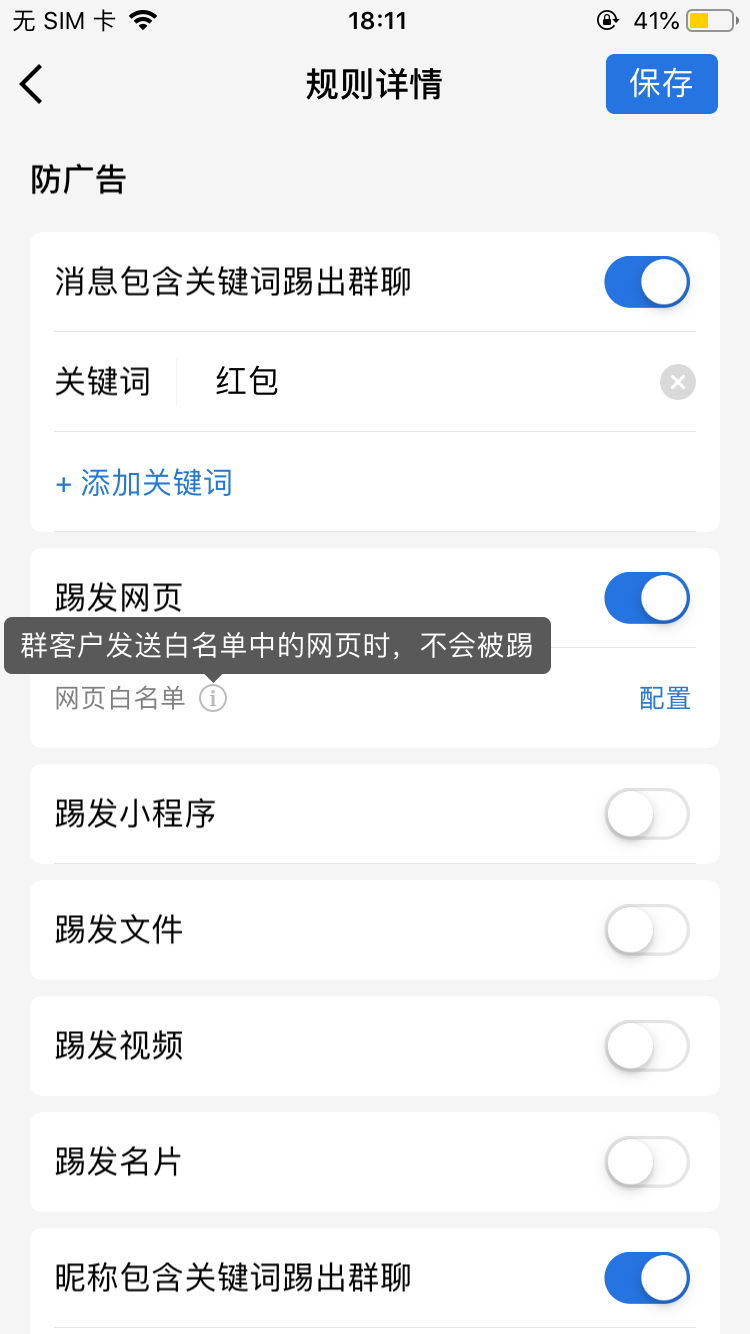 更新的防广告功能包括关键词、网页、小程序、视频、名片,甚至昵称,一旦群成员触发原先设定好的规则,都会被移除或警告!