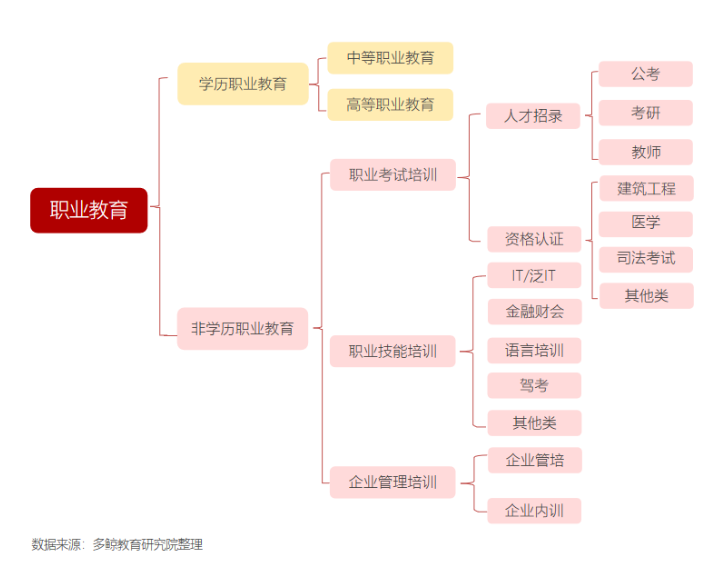 其中,学历类职业教育主要分为中等和高等职业教育,非学历职业教育分为职业考试培训、职业技能培训和企业管理培训。