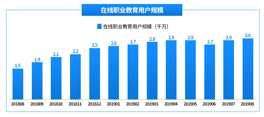 2、受政策支持和技术推动,在线职业教育市场快速增长。2019年,在线职业教育用户规模突破3000万人,整体用户量较2018年同期增速达到100%。