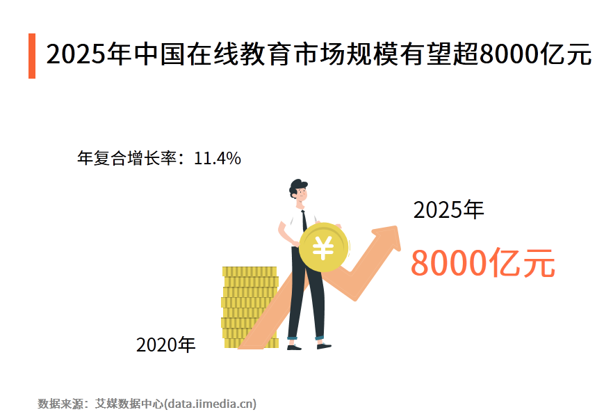 2020年,在线教育全面爆发,直播课堂更是一跃成为教育培训行业的标配。据艾媒咨询数据显示,2019年在线教育市场规模已经突破4000亿元,在疫情进一步刺激下,预计2025年市场规模将达到8000亿元,2020到2025年复合增长率达11.4%,在线教育市场潜力巨大。