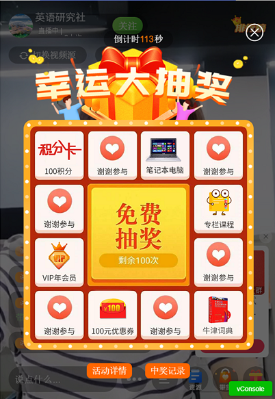 以业内较为主流的SaaS服务商创客匠人搭建的直播间举例,老师可以在直播过程中弹出幸运大转盘,奖品可以设置笔记本电脑、手机、牛津词典等具有一定价值的实物,再搭配平台VIP周卡、专栏课程兑换券、无门槛优惠券等虚拟奖品。一方面,刺激学员积极参与、分享,另一方面,让抽到平台会员体验卡、课程的新用户可以登录平台,感受机构的教学质量,从而刺激转化。