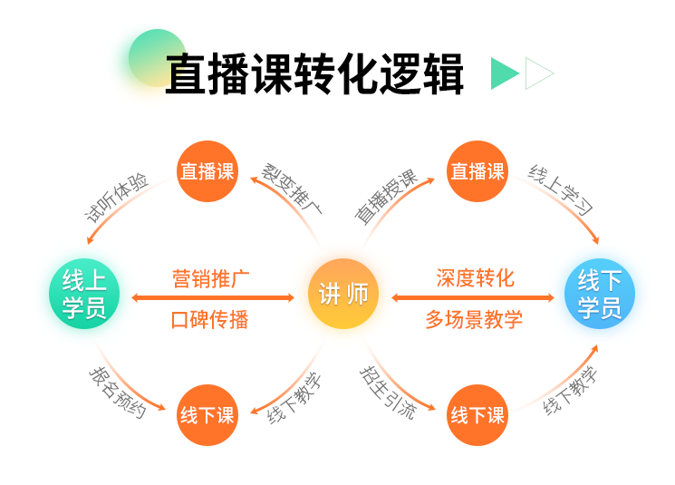 对于线下机构来说,既可以在线下门店推出线上课试听,引导学员进入线上平台,给学员更全面优质的教学体验,又可以在线上利用直播试听裂变推广,口碑传播,吸引更大范围的线上学员。