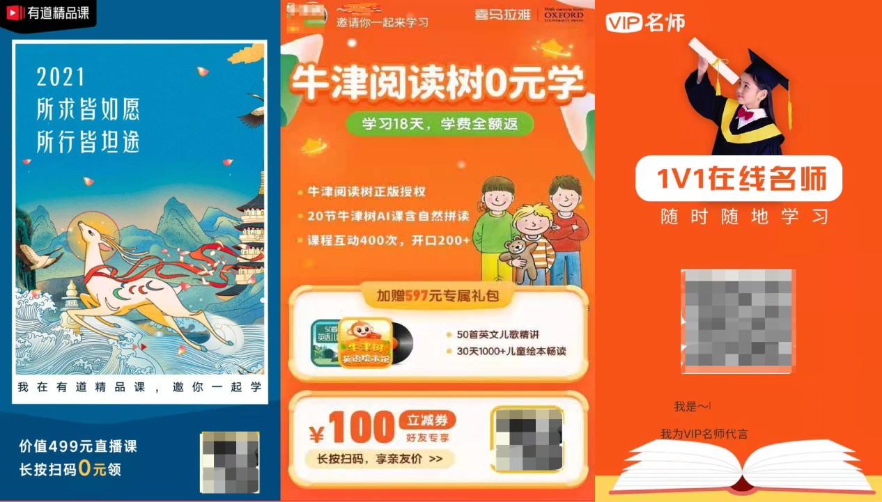 目前来说,涉及低幼及K12、家庭教育等领域的教育机构尤其适合做转介绍、分销和内容裂变,尤其是这类人群中有大量宝妈,因此,很有在线教育公司都把宝妈分销作为自己的一个重头戏。例如核桃编程、有道精品课、喜马拉雅牛津阅读树英语、美术宝、宝宝玩英语、VIP名师在线等,相信大家在自己的朋友圈也已经看到了不少裂变海报。