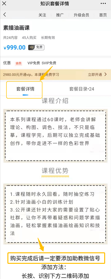 此外,老师还可以在课程详情页末尾放上助教微信二维码,或者是此类课程专属的社群二维码,引导用户添加助教微信,进入社群,来进行后续的用户维护,更好地实现用户留存。