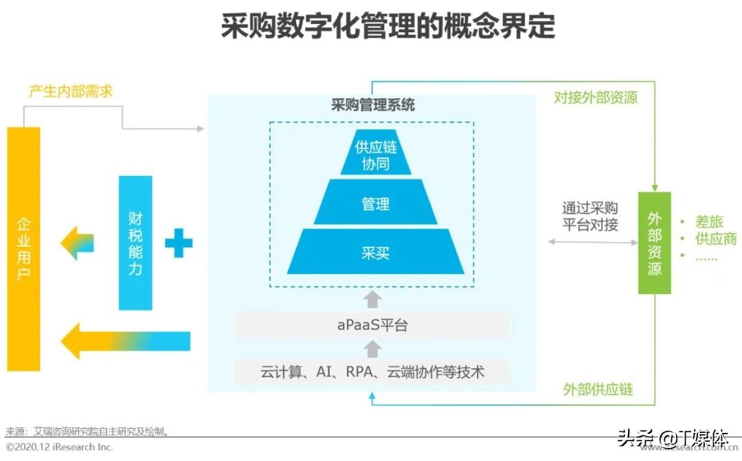 概念界定:采购数字化管理整合了大数据、云计算、流程自动化等技术,助力传统供应链中“采购”环节的数字化升级,为企业提供三位一体的综合解决方案,并不断拓展业务边界,助力产业转型。从信息化向数字化和智能化发展,关注对企业业务成果和企业价值增加。