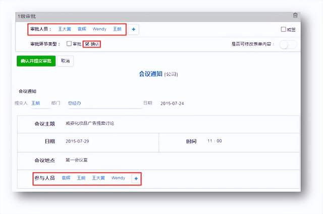 启效云的流程中有一个独特的确认功能。我只要填写一个会议通知单,勾选所有参会人员为审批人员,审批环节类型设置为“确认”,然后点击提交即可。