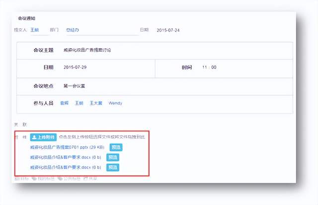 关于会议跑题这个问题一直令我比较头痛。我发现这很大一部分原因是因为开会之前没有确定讨论的主题和事项。因此,在发送会议通知流程时,我会在附件内附上要讨论的主题、PPT、客户相关资料,而大家看到这些资料后,可以在流程中留言提问,届时这些问题会一并放在会上讨论。