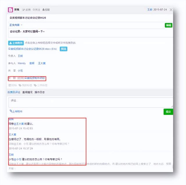 一开始,看得人很少。但是自从这个文档跟任务相关联,大家在执行工作过程中不得不参考会议纪要中的一些工作安排,而在回顾过程中大家会反思会上有没有讨论忽略的点。就这样,参与感被调动了起来,大家的会后反馈也积极了起来。