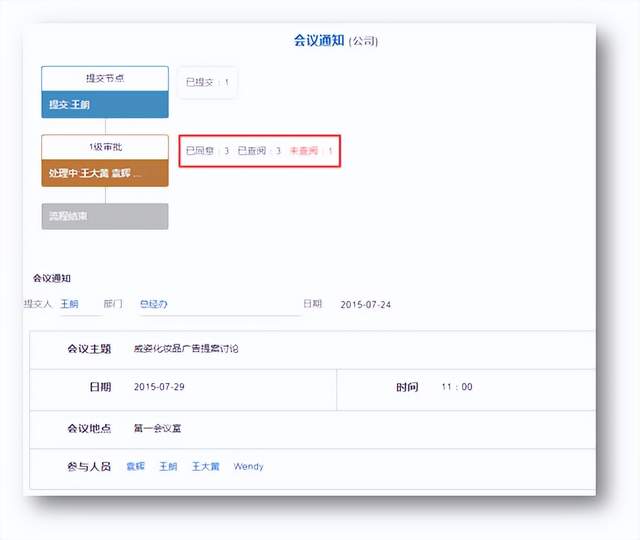 这个功能的妙处就在于会议发起人可以很直观地看到哪些同事没有查阅这个流程、哪些同事查阅了但没有做出动作,方便私聊再次告知。