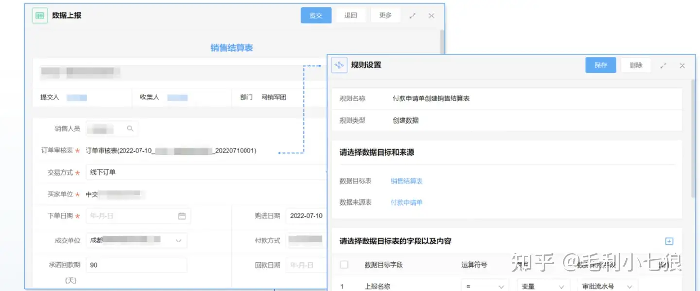 通过启效云「业务表单」搭建业务台账,订单审批流程通过后自动生成销售结算表。