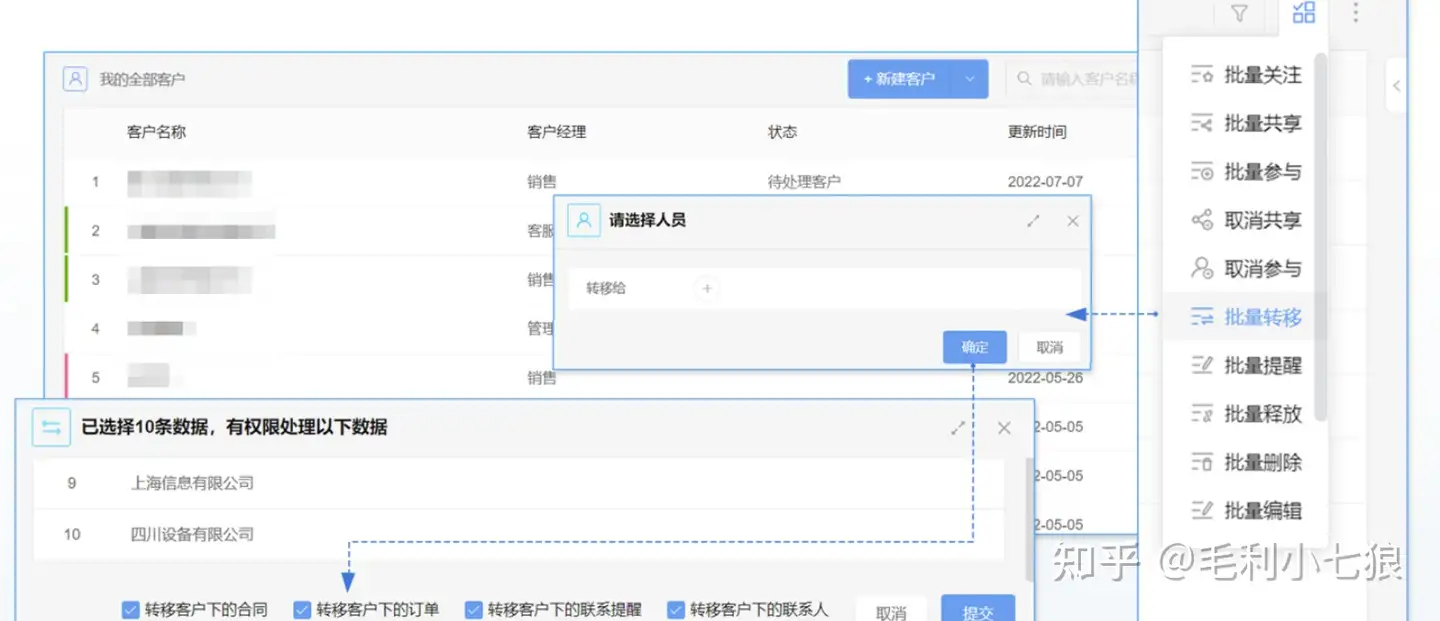 当有销售离职时,可将其负责的客户,包括客户跟进过程中的合同、订单、联系人、联系提醒全部批量转移交接给新的销售,全面了解客户信息,无缝提供服务。