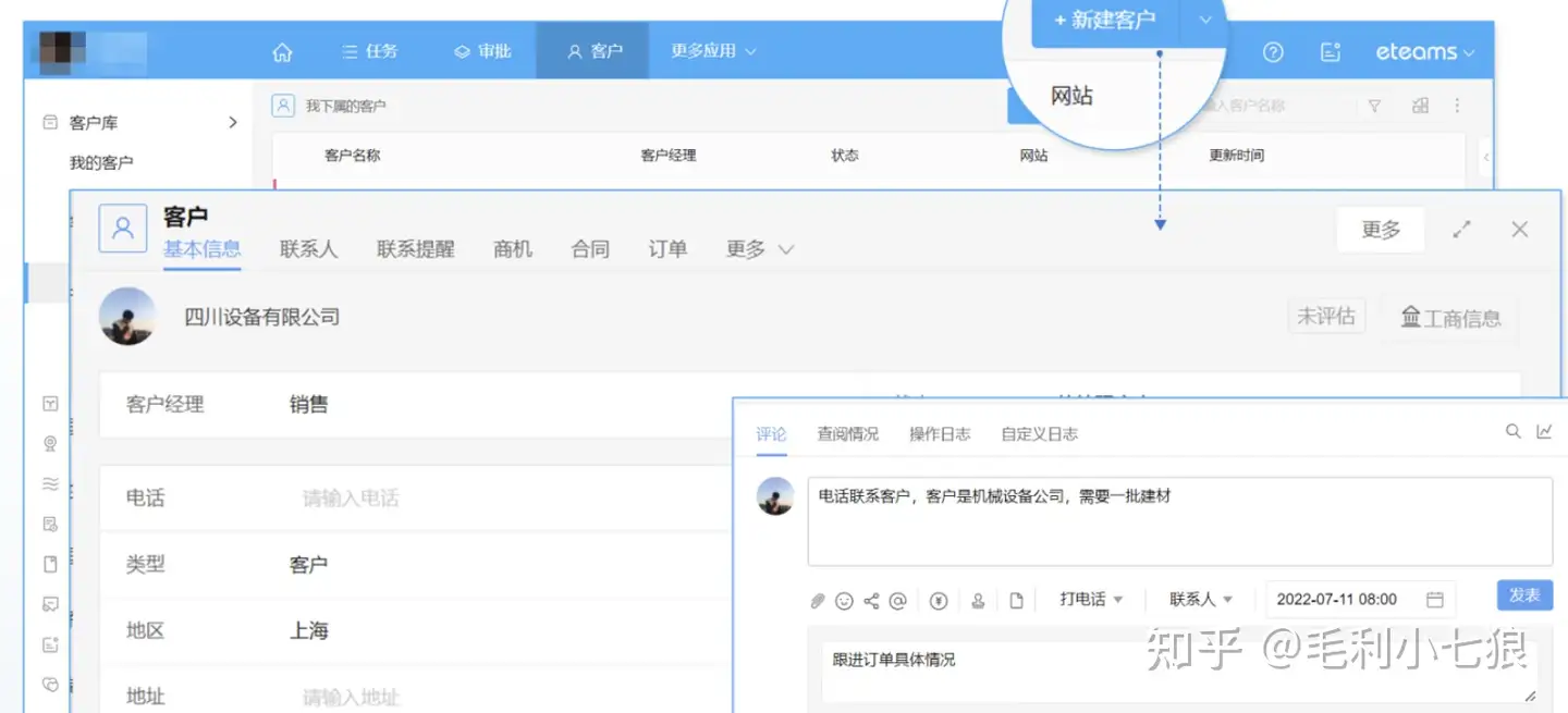 通过启效云CRM进行客户管理,每一个客户都有专属的客户卡片,销售可以随时在客户卡片中反馈跟进情况,并关联客户相关的订单、表单数据,完整记录客户所有信息。