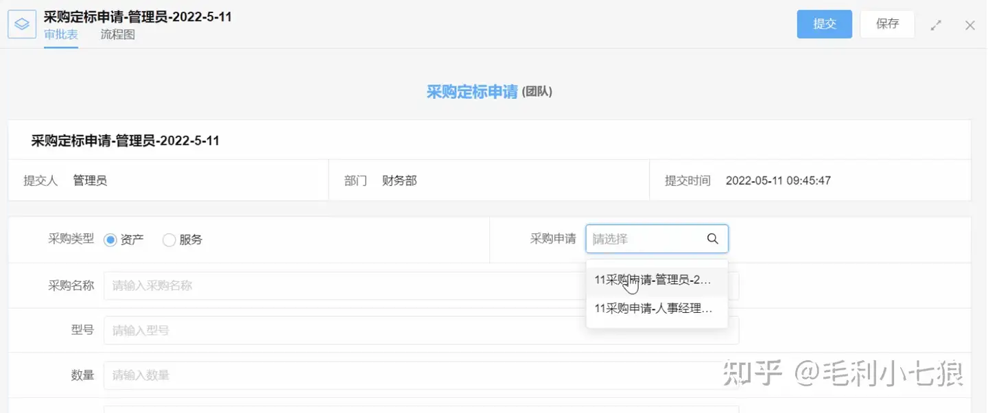 场景:人员增加,行政申请采购一批办公椅,采购申请结束后,发起采购定标申请,关联事前的采购申请,采购明细数据自动填充。