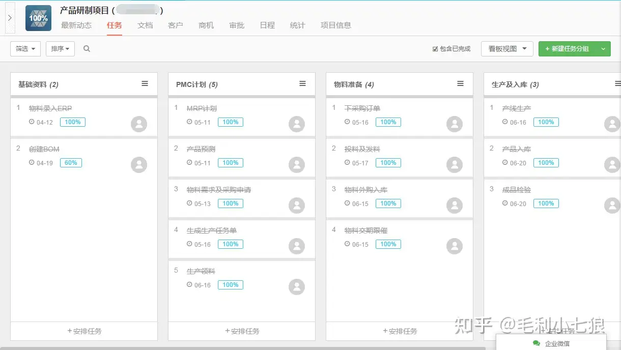 客户的深圳团队负责研发,会用启效云的项目模块进行研发管理。在项目看板视图下,任务进度一目了然。如果基础资料准备的差不多了,项目经理立马着手安排PMC计划,PMC计划已经执行完毕了,那项目经理就会在物料准备上多花些心思。