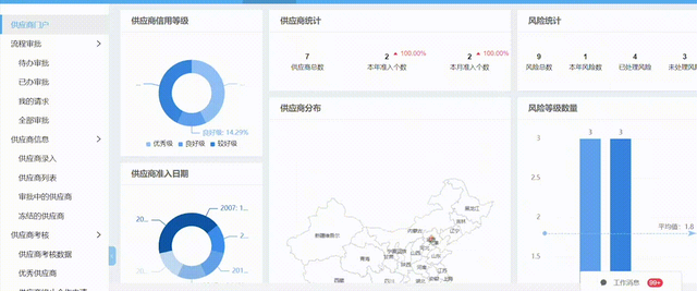 「供应商管理」门户中,所有数据自动沉淀,借助报表引擎,可实现信用等级、数量统计、风险统计、考核等级等数据多维度呈现。