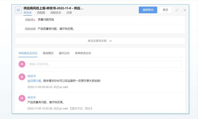 后续供应商对于问题的反馈全部在流程里统一回复,避免信息分散的情况,帮助管理人员快速做决策。