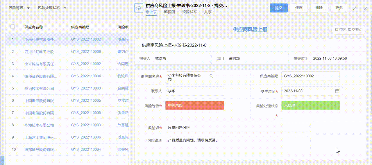 通过启效云OA表单流程引擎,可灵活搭建供应商风险等级评定体系,一旦在合作过程中发现风险因素,都可通过审批流程将问题传递给供应商,提醒供应商及时跟进并排除风险。