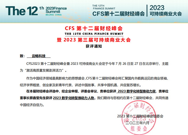 云畅科技荣获CFS第十二届财经峰会双项大奖