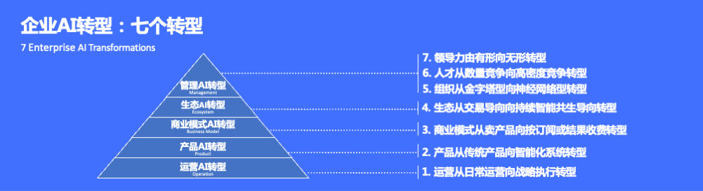 传统企业如何进行AI转型?我的答案是,必须突破这七大转型关键: 1. 运营:从日常运营向战略执行运营转型; 2. 产品:从传统产品向智能化系统转型; 3. 商业模式:从卖产品向按订阅或按结果收费转型; 4. 生态:从交易导向向持续智能导向转型; 5. 组织:由金字塔型向神经网络型转变; 6. 人才:由数量竞争向高密度竞争转型; 7. 领导力:由有形向无形转型。 这七大转型里,业务转型(前四项)要成功,必须靠管理转型(后三项)做支撑。而管理转型的核心,离不开三点: 一是文化转型,一把手要带好头。一把手得有坚定的决心、意志力和信念,用言行影响团队,让大家心往一处想、劲往一处使。我常说,现在是我最好的年华——多年积累的经验和意志,正好能帮助公司年轻人,激发他们的创造力。 二是人才转型,要靠高密度人才队伍。AI转型需要大量优秀的年轻人才,他们熟悉技术、接受新鲜事物、敢于冲锋陷阵。有了这样一支高精尖队伍,转型才有源源不断的动力。 三是组织转型,打破边界建神经网络。过去的金字塔型组织层级分明、效率低下,AI时代要建成开放、无边界、平等自主的神经网络型组织,让每个成员都能自主决策,快速响应变化。 03 金蝶底气:产品为核,案例为证