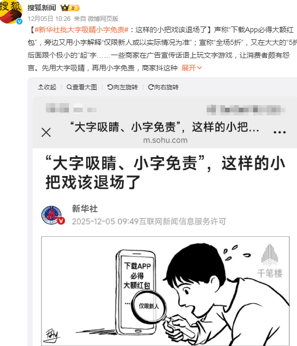 近日,新华社刊发题为《“大字吸睛、小字免责”,这样的小把戏该退场了》的评论文章,直接向厂商惯用营销套路开炮。