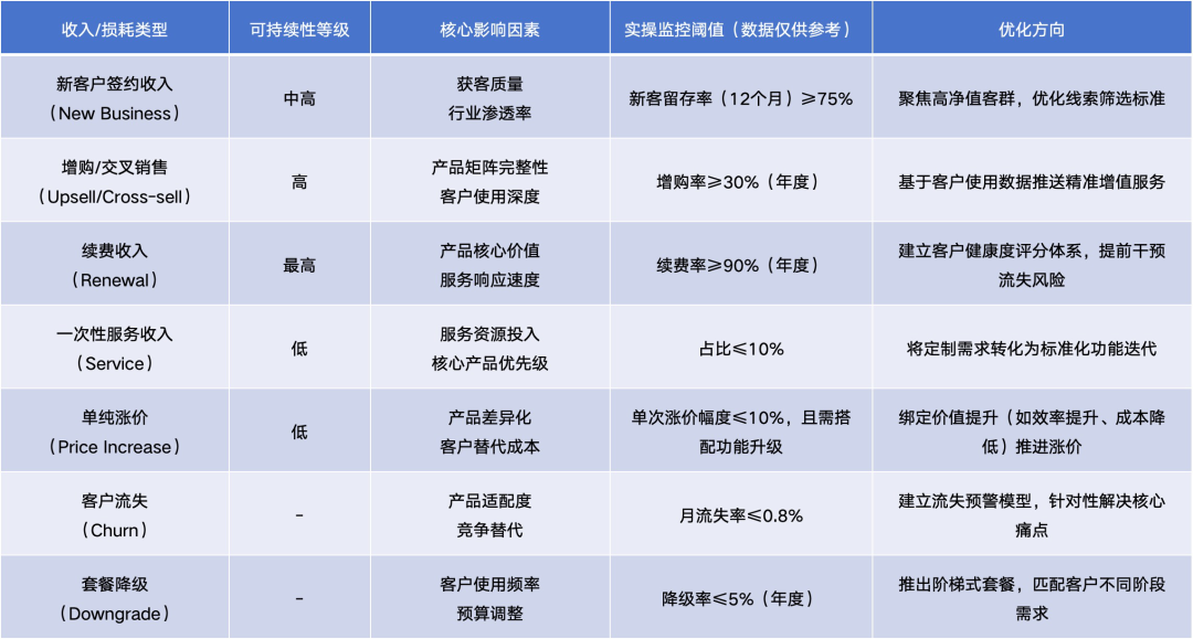 收入纯度=(持续性收入÷总ARR)×100%,这一指标直接反映增长质量: